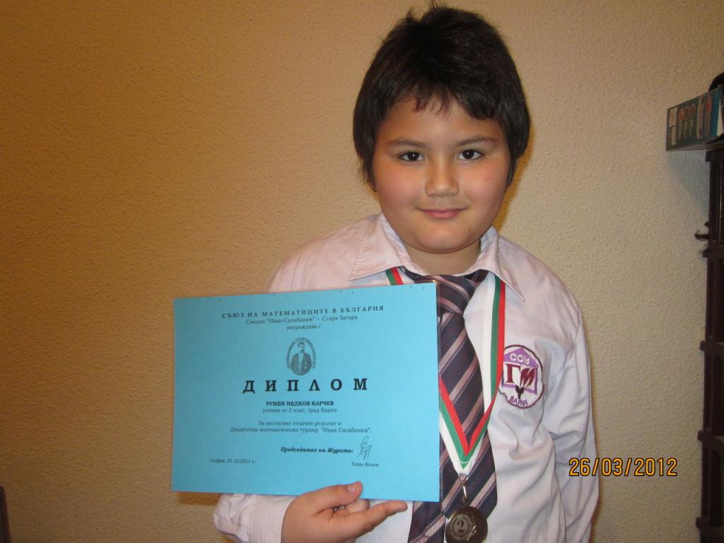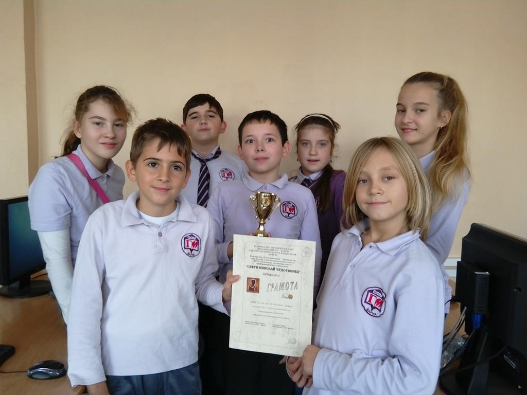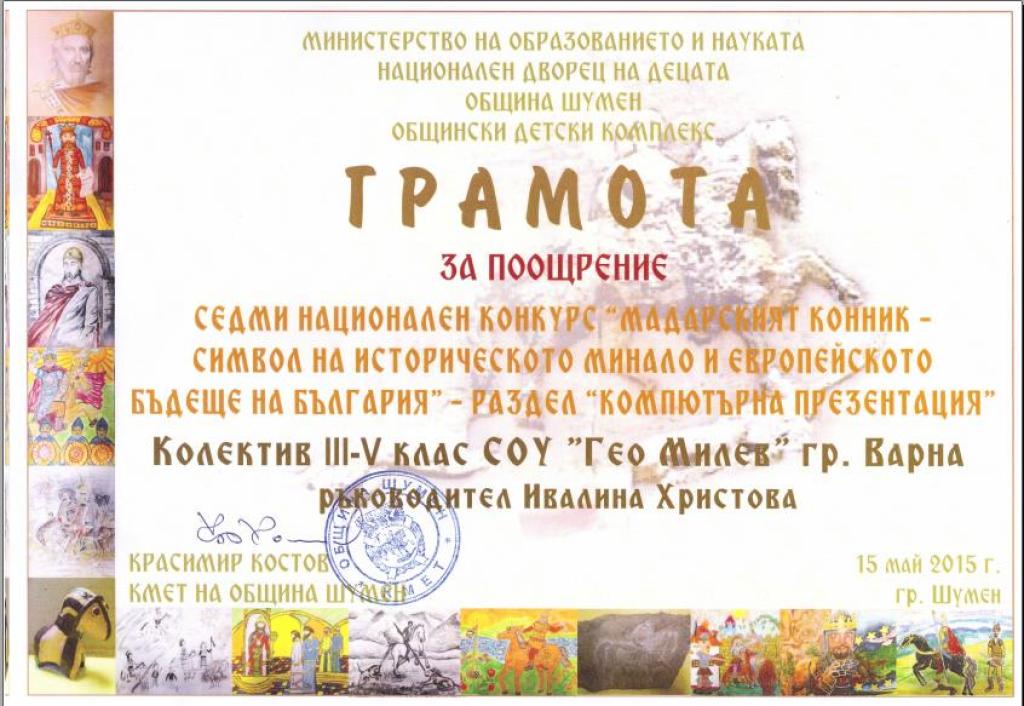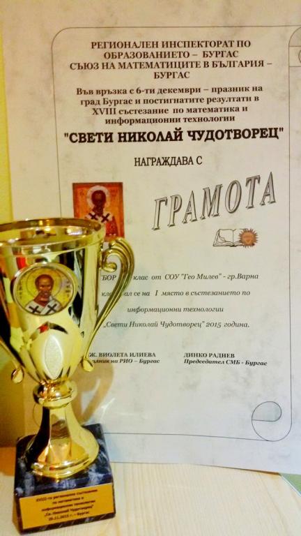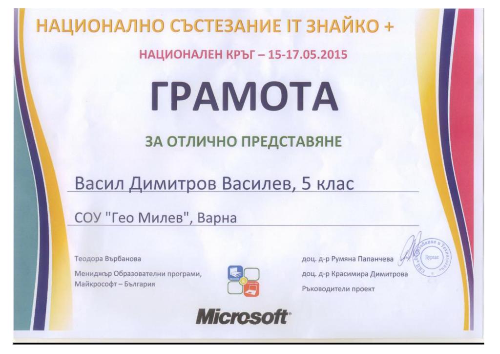 Галерия Галерия Постижения и награди Теодор Ценов Иванов 2 клас - грамота за отлично представяне в национален турнир по математика „Иван Салабашев” Румен Карчев ІІ а клас - второ място при второкласниците в национален турнир по математика „Иван Салабашев” Състезание по информационни технологии „Св.Николай Чудотворец” – гр.Бургас 2015 Състезание по информационни технологии „Св.Николай Чудотворец” – гр.Бургас 2015 Състезание по информационни технологии „Св.Николай Чудотворец” – гр.Бургас 2015 Състезание по информационни технологии „Св.Николай Чудотворец” – гр.Бургас 2015 Състезание по информационни технологии IT Знайко+ за възрастова група 5-8 клас. Васил Василев 5 „г” клас - грамота за отлично представяне от състезанието по информационни технологии IT Знайко+ за възрастова група 5-8 клас Кристиян Димитров 5 „б” - грамота за отлично представяне от състезанието по информационни технологии IT Знайко+ за възрастова група 5-8 клас конкурс „Мадарският конник – символ на историческото минало и европейското бъдеще на България” – 2015 година” Поощрителна награда за колективно участие в раздел „Компютърна презентация” от Седмия национален конкурс „Мадарският конник – символ н Състезание по информационни технологии „IT Знайко“ 1 - 4 клас. 2015 предишна123456789следваща Обратно